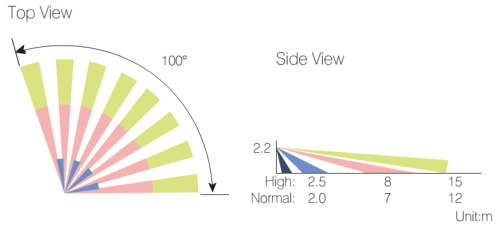 | Detection range | 100° wide, 15m @ 25°C (adjustable) |