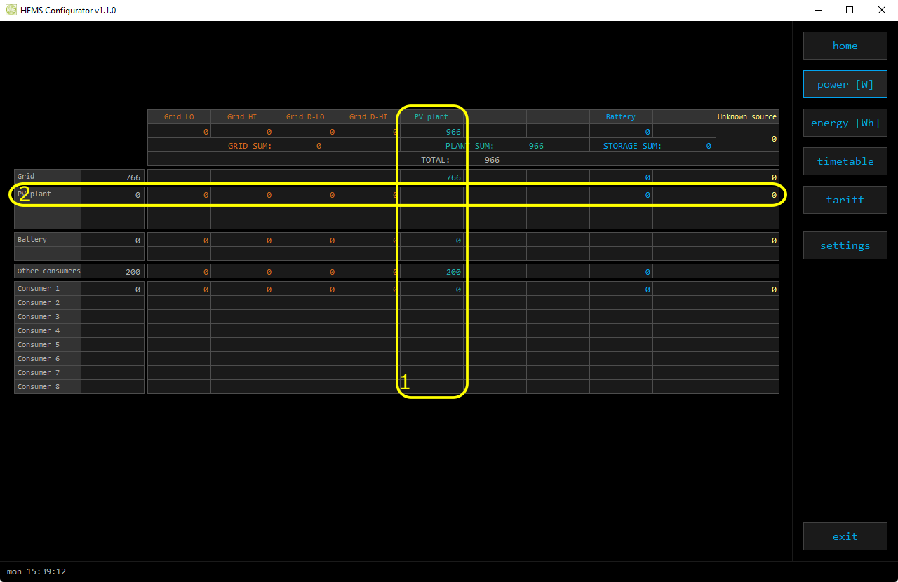 | › | From grid | Tariff (LO, HI, D-LO, D-HI) and power from grid in W |