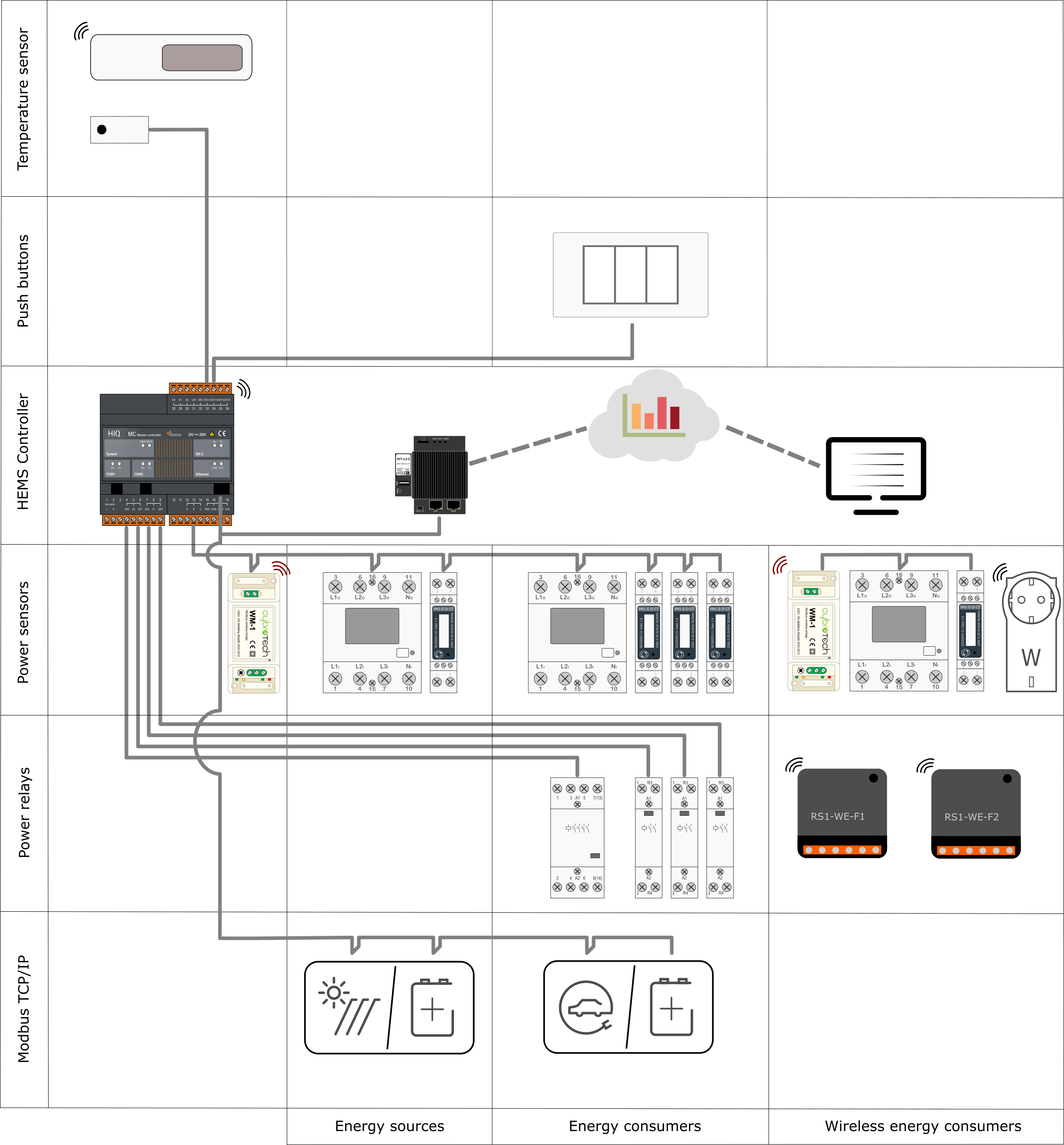 Below is illustrated HEMS scheme. Connection between controller and units can be wired (directly on port, modbus RTU/TCP) or wireless (using EnOcean protocol or wireless modbus to modbus bridge):