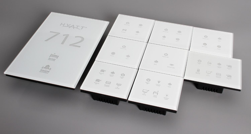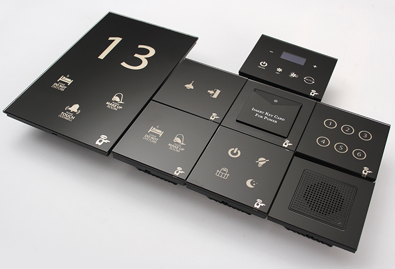 Attractive glass-finished panels, which can be fully customized (color, appearance, hotel logo) are an integral part of the system. Alternatively, standard push buttons can be used.